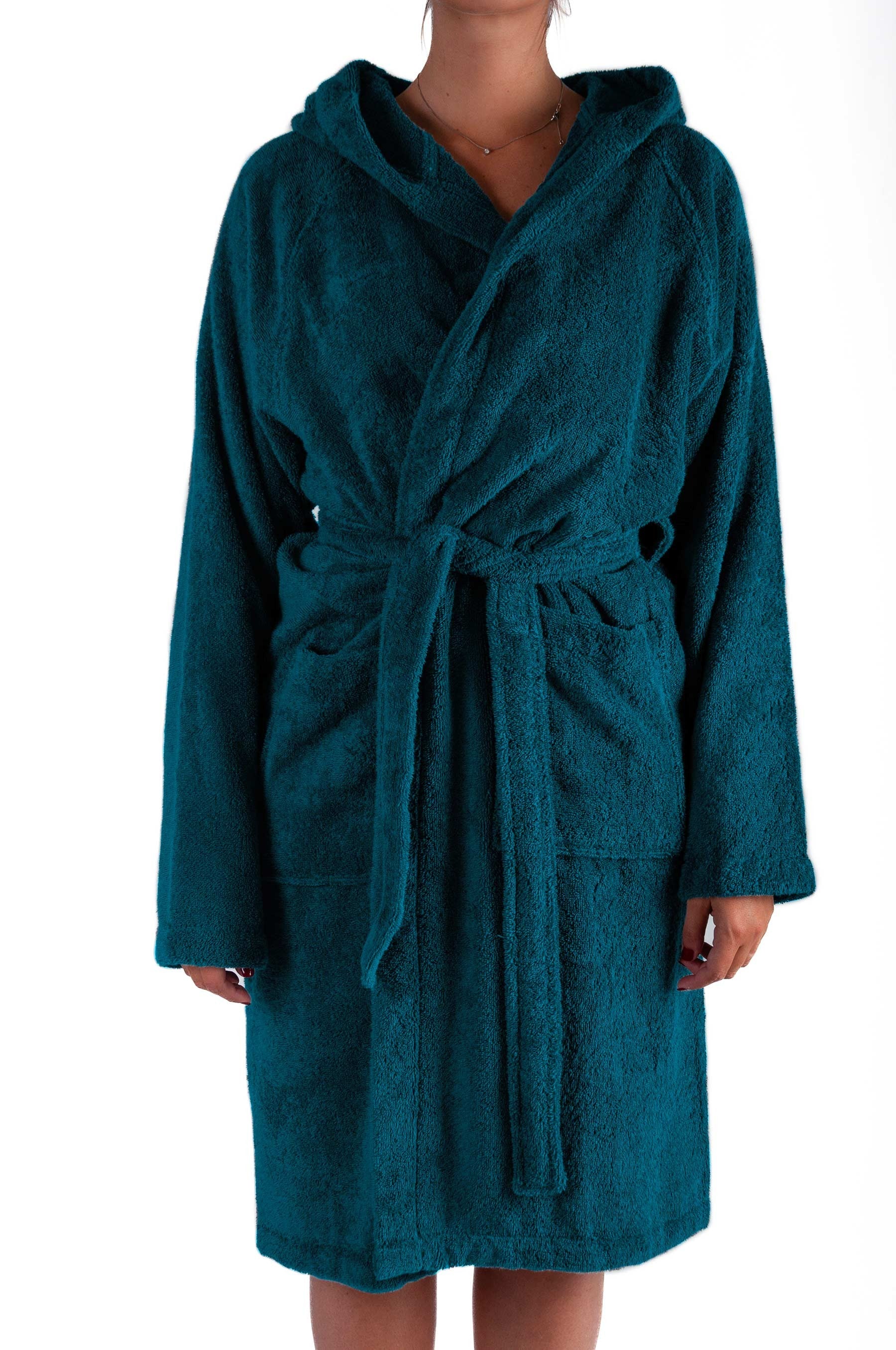 Il design è pratico e moderno: cappuccio funzionale, cintura a passanti e ampie tasche laterali pensati per un uso quotidiano, dalla doccia mattutina al relax serale. La sua asciugatura rapida lo rende perfetto anche per chi è sempre in movimento, senza rinunciare al comfort.