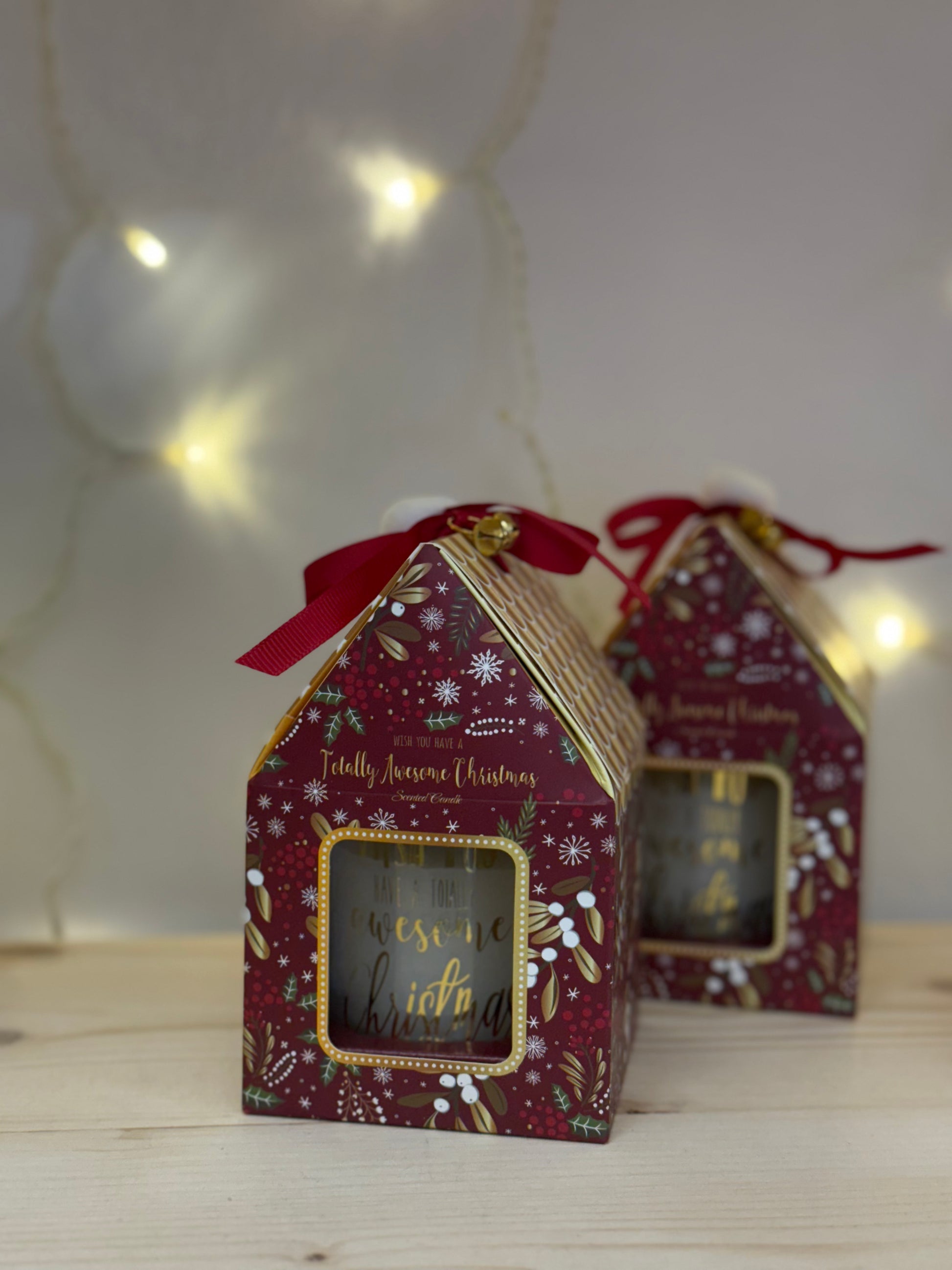 Un’elegante confezione a forma di piccola casetta rossa decorata con dettagli dorati e un fiocco in raso, perfetta da regalare e da esporre come decoro natalizio.