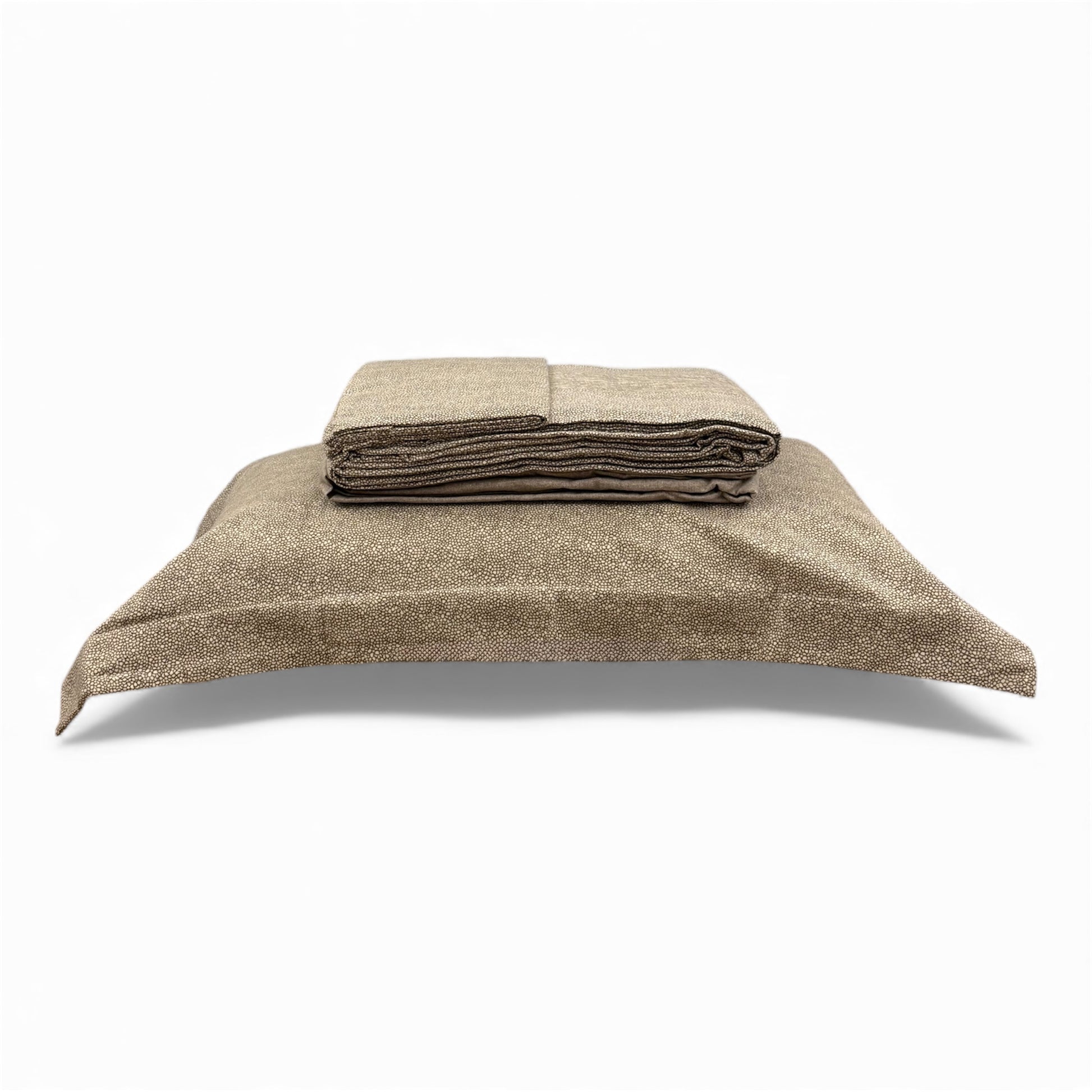 Un set pratico, caldo e raffinato, perfetto per rinnovare la camera da letto con uno stile moderno e discreto. La fantasia micro pois è elegante e facile da abbinare, mentre il sotto tinta unita completa il look con armonia.