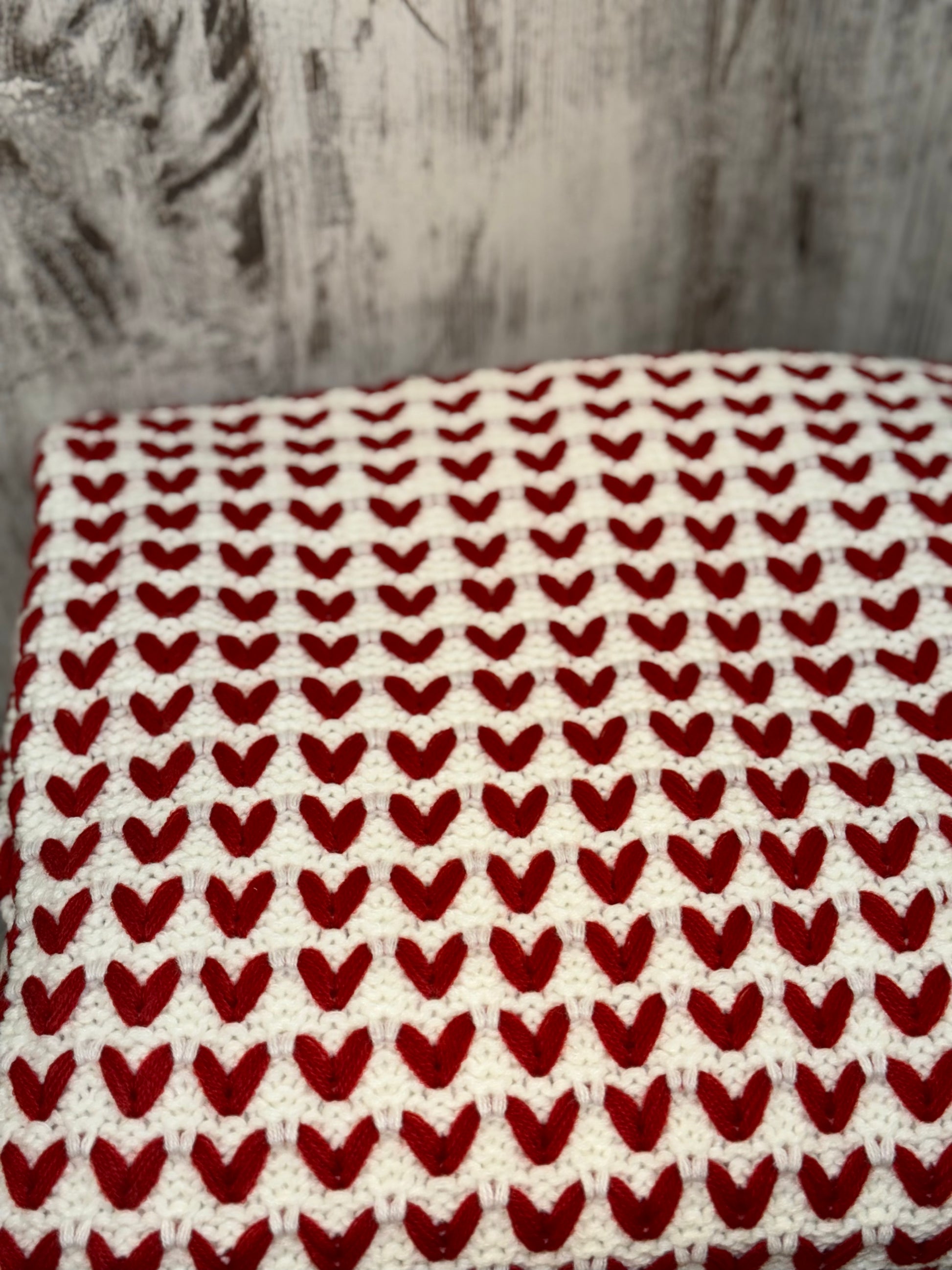 Coperta in Maglia 1500gr Lavorata ad Intreccio con Cuoricini Rossi, Passamaneria a Frange e Nappe agli Angoli 160x210cm