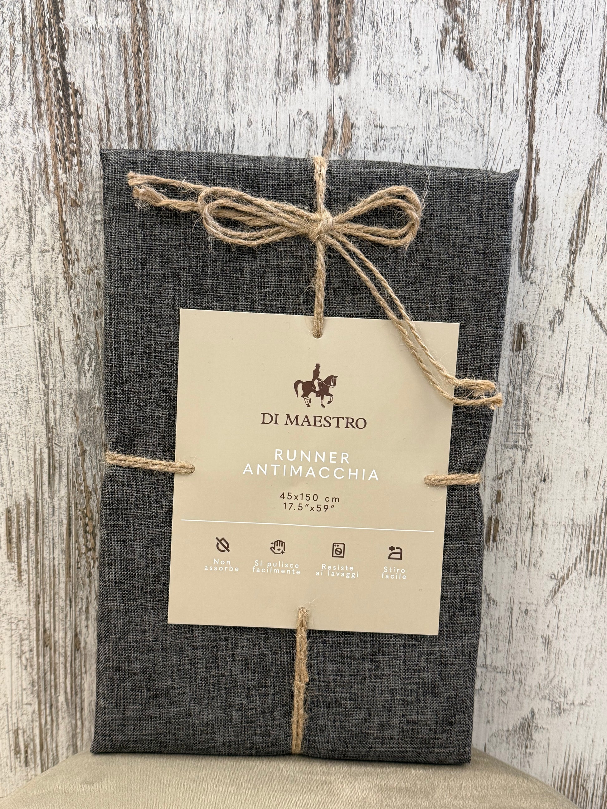 Il runner antimacchia Di Maestro è la soluzione ideale per proteggere e valorizzare tavoli e superfici con eleganza e praticità. Realizzato in tessuto trattato, non assorbe i liquidi, si pulisce facilmente e mantiene il suo aspetto anche dopo lavaggi frequenti.