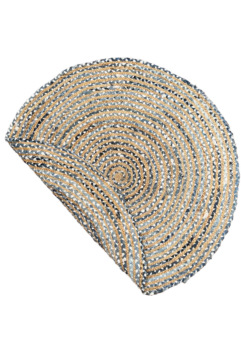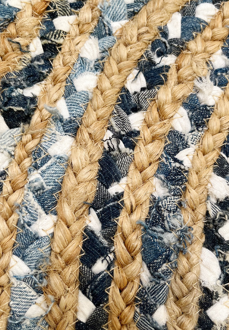 Realizzato intrecciando a mano juta naturale (60%) e fili di cotone multicolore (40%), crea un effetto vivace e armonioso, con delicate sfumature blu e sabbia che si abbinano facilmente a ogni arredamento.