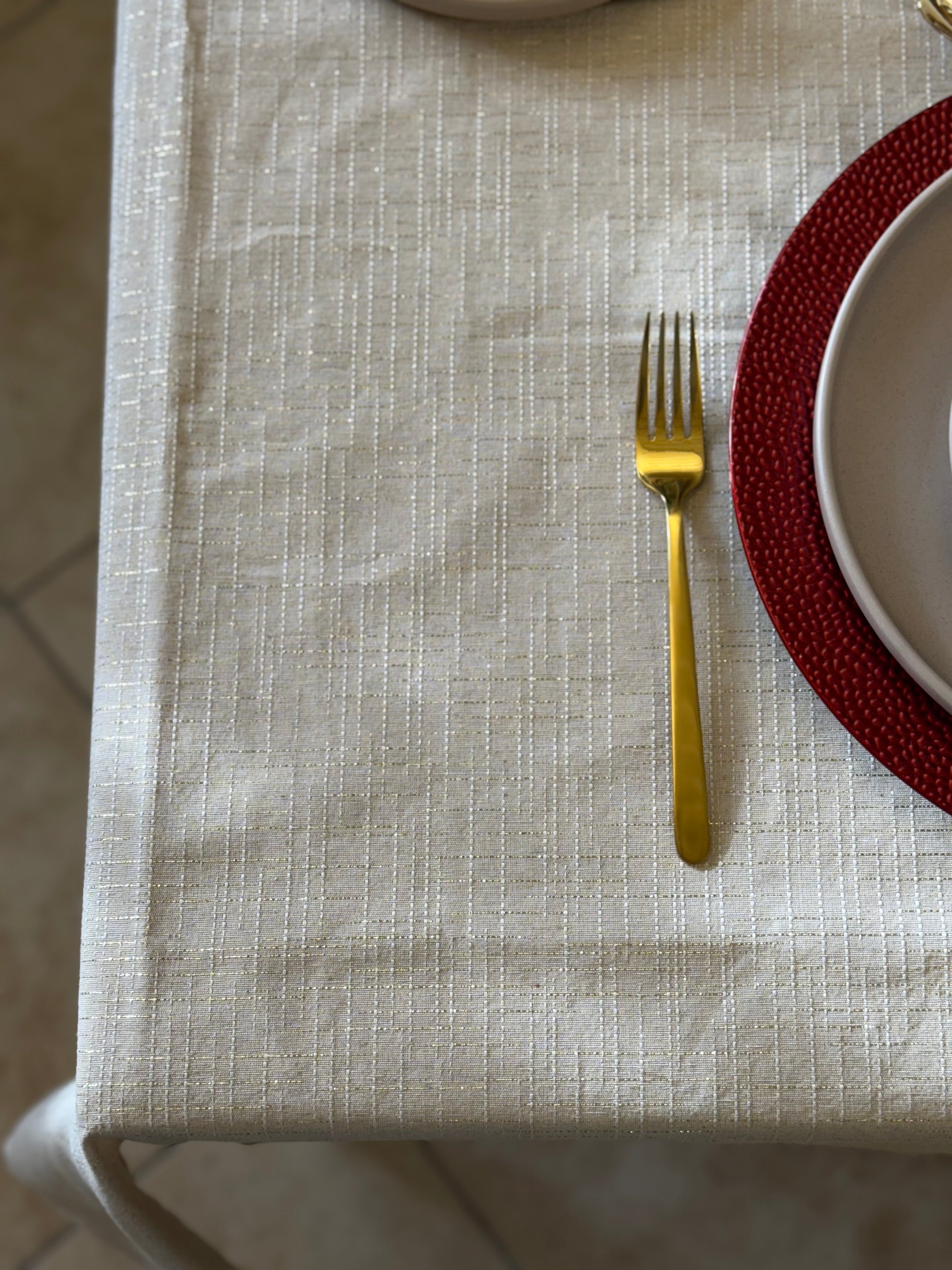 Porta in tavola l’atmosfera delle feste con la Tovaglia Natalizia Jacquard Lurex Beige di Tessitura Zambaiti, realizzata in Italia con materiali di alta qualità.